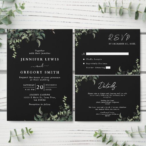 Black White Greenery Botanical Watercolor Wedding Invitation