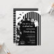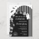 Adorable cute gender neutral Little boo Halloween illustrations baby shower party invitation with a black and white stripes theme, arch , balloons, white ghosts and black pumpkin, with black cute bats with black arch.