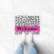 Welcome visitors to your home with this stylish and sophisticated black and white leopard skin pattern door mat. This door mat is customised with the word Welcome that you can change to another word or name. A bright hot pink fuchsia strip gives an area for personalisation and a pop of colour. Enjoy this popular and contemporary design that will add a trendy home decorative accent. This leopard design is available in several colour combinations in this store.