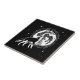 Black and white linocut of a husky howling at the moon with a starry sky. Original design includes a Scandinavian landscape with snowy mountaintops, trees and moose.