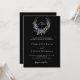 Black background. A floral wreath made of lavender flowers and watercolored eucalyptus greenery. Personalise and add your monogram initials, names, and details. White text.