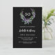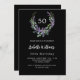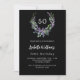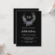 Black background. A floral wreath made of lavender flowers and watercolored eucalyptus greenery. Personalise and add your name, age and party details. White text.