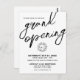 A bold and elegant black and white postcard invitation designed for a business grand opening, product launch, or brand event. The front features “Grand Opening” in oversized handwritten script calligraphy that stretches across the top and off the edges of the card for a dramatic, sophisticated statement.