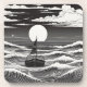 A small boat is alone on a vast, stormy sea, rendered in stark black and white. The waves are large and choppy, and the sky is dark and ominous. The boat, tossed about by the rough sea, appears small and vulnerable, emphasising the vastness and power of the ocean.