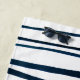 Black and white watercolor stripes with a vivid blue mediterranean water line. Personalise the towel with your name.