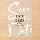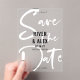 Acrylic typography save the date card with a modern script in white printed across the whole card and your names in bold black letters centred on the modern acrylic save the date card without a photo. Eye-catching acrylic save the date card with a modern no photo design with cool bold fonts and a transparent background that makes your save the date card stand out.