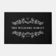 Black door mat with your name framed by mirrored half-wreaths of leaves and berries. Add your initial and the year your family was established in an elegant white font.