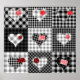 Seamless background pattern. Will tile endlessly. Black and white patchwork with hearts and red patches.
