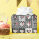 Seamless background pattern. Will tile endlessly. Black and white patchwork with hearts and red patches.