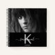 A chic black background.  Personalise and add your own photo, a name, monogram letter and a year. The name is written in white with a large modern hand lettered style script with swashes. The monogram letter in grey. For school, work as a diary and journalling. To keep the swashes only delete the sample name, leave the spaces or emoji's in front and after the name