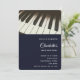 A birthday invitation with a musical themed photograph featuring up close image of black & white piano keys.