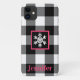 This modern and trendy black and white Buffalo Plaid cell phone case has a large white central snowflake on a pink and black smaller square, along with customisable text, making it perfect for a Christmas or winter birthday gift.