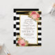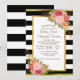 Pink and red floral on black and white horizontal striped wedding invitation with a glittery gold trim. Text, font, font size and colour are completely customisable, so this card can be customised to perfectly suit your needs.