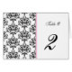 Chic wedding reception table number tent card done in a lovely black and white damask pattern, on the left side and solid white, on the right side of the card. A thin pink line separates the two different backgrounds. Black text and number, on the right white side is ready to personalise. Change number and text for each table at your reception.