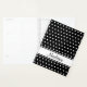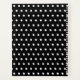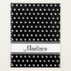 This patterned design has a black background with white polka dots on the front and back. The name is in a script font within black and white stripes and can be customised using the template field.