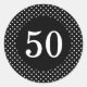 This circular birthday sticker is decorated with black and white polka dots.