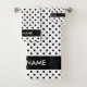 Black and white polka dots personalised bath towel set. Cute polkadotted pattern design. Elegant home decor for stylish bathroom, toilet, guest house, summer cabin, vacation home, hotel, b&b etc. Custom background colours. Includes little washcloth, small hand towel and big bath towel. Trendy housewarming present idea for friends, family, couple, newlyweds etc. Modern polkadot design with custom colour to match your interior. Dots can be made big or small. Add your own custom name, quote or monogram.