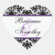 This 1.5" diameter heart shaped black and white damask with purple wedding favour sticker and/or envelope seal matches the wedding invitation shown below. You can change the text to say whatever you want, and you can also change the sticker shape and size to adorn your wedding or party favours with. If you require any other matching items in this design, email your request to niteowlstudio@gmail.com.