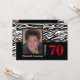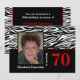 Black white red zebra print 70th birthday photo invitation, featuring a black white zebra animal print pattern on top, solid black colour to the bottom, your photo and a red stripe. A modern, fashionable, stylish design of a classic theme with a light touch of vintage/retro.Trendy, contemporary and classy feminine design, perfect for a milestone 20, 30, 40, 50, 60, 70, 80, 90 and why not 100th birthday. Change the number to fit your needs.