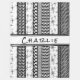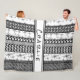 Personalise this modern, unique, black-and-white blanket by changing the name over the overlay. /// Often a favourite, black and white is, in this design, covered with retro patterns interspersed with vertical black stripes. Stars, sparkles, flowers, rounded squares with circles inside, other circles... Clean, simple, basic, fun.