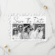 Black and white script calligraphy three photo collage Save the date card. The backside includes a black and white pattern with the couple's names.
