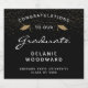Celebrate your graduate's milestone in style with these custom graduation sparkling wine bottle labels, featuring the words "Congratulations to our Graduate" in white text on a black background. The word "Graduate" appears in a graceful handwriting-style script. A pair of gold faux glitter mortar board caps and a scattering of gold confetti decorate the top portion of the label. Personalise it with your grad's name, school, and year of graduation.