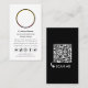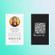 Modern black and white business card with social media icons for a content creator or an influencer featuring a scannable QR code on the back, and on the front it has the profile picture, account handle, description, and space to add your email, website, or any custom text you need. Remove or add social media icons or personalise it by clicking the button to edit the design.
