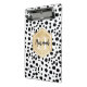 Stylish Dalmatian spots pattern with a faux gold foil label featuring customisable name and monogram templates. A cute monogrammed mini clipboard with black and white spots pattern and golden elements. To change the font colours and font styles click the "personalise" button and then click the "customise further" button.