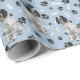 An image of a beautiful black and white Springer Spaniel dog is the feature in the pattern on this all occasion gift wrapping paper. The dog sits amid a pattern of black paw prints and white bones, and is repeated on a light blue background.
