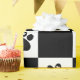 Horizontal black and white checked background and black paw prints in white squares. There is a small white heart in each pawprint