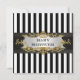 This customisable design features black and white stripes, a black ribbon, and a white gradient label in a gold look frame.