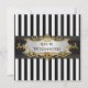 This customisable design features black and white stripes, a black ribbon, and a white gradient label in a gold look frame.