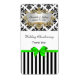 A design with a black and white damask pattern paired with a black and white striped pattern. It's embellished with a lime green satin look bow ribbon.