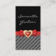 Black white stiped pattern with red bow and jewel business card template that features a black and white pattern with diagonal stripes and a red ribbon across it with a bow and a heart shaped jewel also in red with gold outline and strass which adds a little bling. Note the bow and the heart diamond jewellery is a "printed on" illustration and not a real crystal, so are the strass. An elegant and stylish feminine business card design. Trendy, fashionable and modern perfect for professional or personal use.