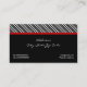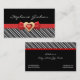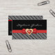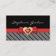 Black white stiped pattern with red bow and jewel business card template that features a black and white pattern with diagonal stripes and a red ribbon across it with a bow and a heart shaped jewel also in red with gold outline and strass which adds a little bling. Note the bow and the heart diamond jewellery is a "printed on" illustration and not a real crystal, so are the strass. An elegant and stylish feminine business card design. Trendy, fashionable and modern perfect for professional or personal use.