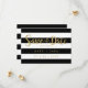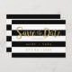 Modern Save the Date wedding invitation cards with black & white striped background with gold foil effect font.