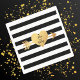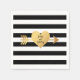 Paper napkins for an engagement party or wedding reception with a black and white striped pattern. Insert bride and groom's names on the golden heart and arrow.