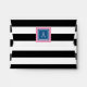 Striped RSVP envelope in black and white with a pink lining personalised with your address. The back is decorated with a monogram in matching pink and blue.