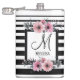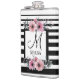 Black & White Stripes Pink Floral Monogram Hip Flask