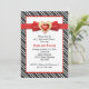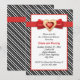 Black white striped pattern with red jewel and bow personalised wedding rehearsal dinner invitation that features a border of black and white diagonal stripes and a red ribbon across it with a bow and a heart shaped jewel also in red with gold outline and strass which adds a little bling. Note, the heart diamond jewellery is a "printed on" illustration and not a real crystal, so are the strass. This trendy design is part of a wedding set and combines its modern and trendy elements with the Old English font that gives it a touch of vintage and retro feeling. An elegant, stylish design perfect not just for a winter wedding.