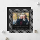 Festive plaid holiday photo card features your favorite image on a black and white tartan plaid background. "Merry Christmas" appears beneath in white script lettering, with your family name(s) and the year in classic white type. Personalize the back with two additional photos and a custom message if desired.