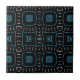 Seamless decorative geometric pattern featuring geometric shapes in white and teal on a black background.