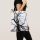 This tote bag features an artistic, black and white abstract pattern of the top of a tulip tree in winter with bare branches in silhouette.