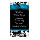 Elegant mini wedding wine labels ready for you to personalise with your own information. Graphic artwork of a black label, with a black and white damask design on top and bottom. A turquoise stripe and a pretty turquoise bow decorate this custom label. Great for your wedding reception or your home made wines.