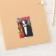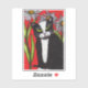 This vinyl sticker has a black and white tuxedo cat with green eyes sitting in front of white daisies with green leaves on a vibrant red background.