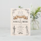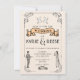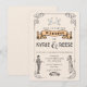 This elegant wedding invitation features a vintage theme with sepia tones and a parchment-style background. The invitation showcases ornate, antique-style fonts and intricate decorative flourishes, lending a classic and timeless feel. Illustrations of a dapper gentleman and a graceful lady in vintage attire, along with vintage car graphics, add to the nostalgic charm. The overall design is sophisticated and invites guests to celebrate in a beautifully traditional manner.