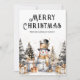Send warm wishes to loved ones with this charming personal Christmas card featuring a festive watercolor snowman design. The front showcases a delightful black and white snowman wearing a top hat and gold scarf, surrounded by golden accents, festive trees, and presents—bringing a whimsical and cosy winter feel.
