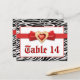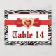 Black white zebra print with red bow and jewel wedding personalised table number postcard that features a black and white zebra print border and a red ribbon across it with a bow and a heart shaped jewel also in red with gold outline and strass which adds a little bling. Note the bow and the heart diamond jewellery is a "printed on" illustration and not a real crystal, so are the strass. This trendy design combines its modern and trendy elements with the Old English font that gives it a touch of vintage and retro feeling. An elegant, stylish design perfect not just for a winter wedding.
