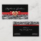 Black white print pattern pattern with red bow and jewel business card template that features a black and white pattern zebra print and a red ribbon across it with a bow and a heart shaped jewel also in red with gold outline and strass which adds a little bling. Note the bow and the heart diamond jewellery is a "printed on" illustration and not a real crystal, so are the strass. An elegant and stylish feminine business card design. Trendy, fashionable and modern perfect for professional or personal use.