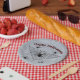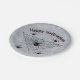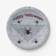 This paper plate has a triangle shaped black spider web with numerous poisonous black widow spiders with red hourglass marks on a rustic look white. Customise the Happy Halloween text with the template.
